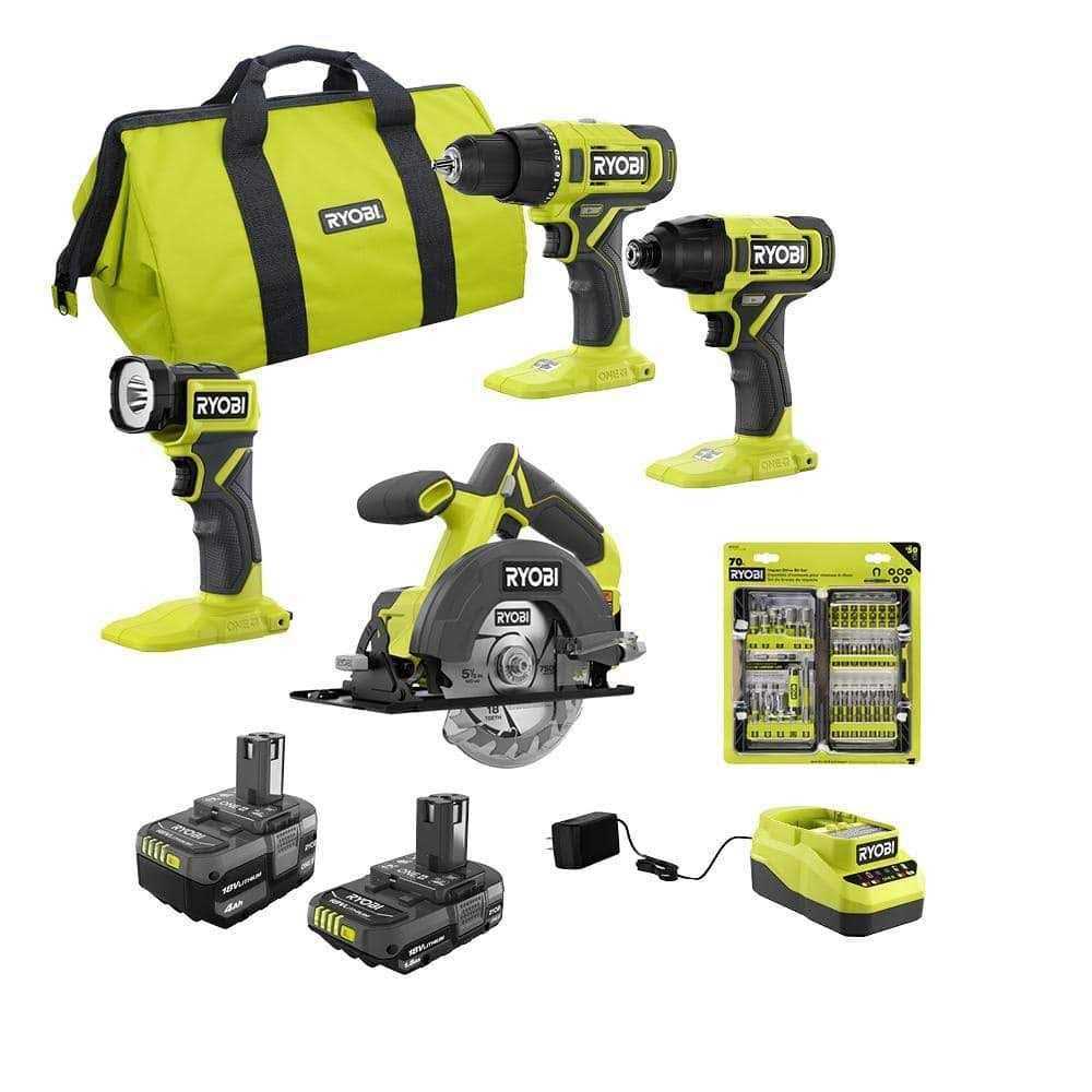 Ryobi ONE+ 18V Cordless 4-Tool Combo Kit with 1.5 Ah Battery, 4.0 Ah Battery, and Charger