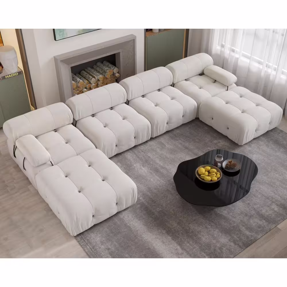 J&E Home 151.2 in. W Round Arm U-Shaped 6-Seater Velvet Free Combination Sofa with Ottoman in Beige