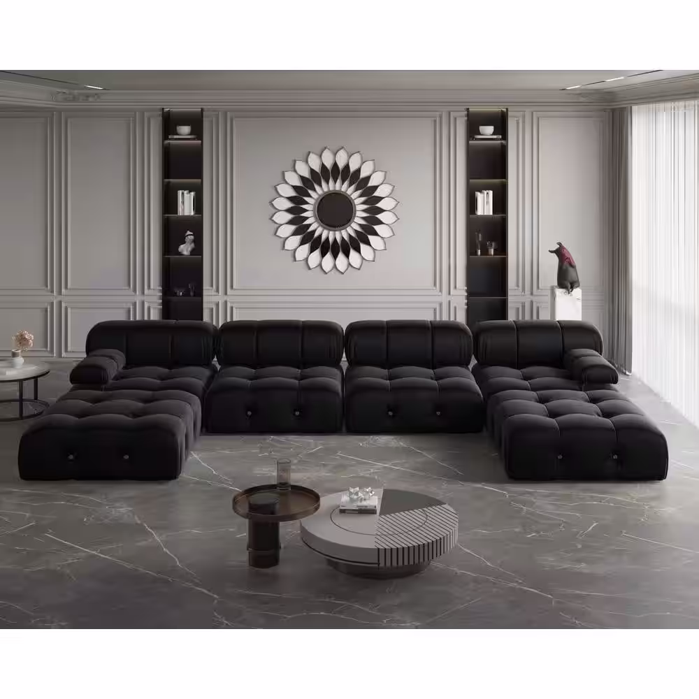 J&E Home 138.6 in. W Square Arm 4-Piece U Shaped Velvet Free Combination Modular Sectional Sofa with Ottoman in Black
