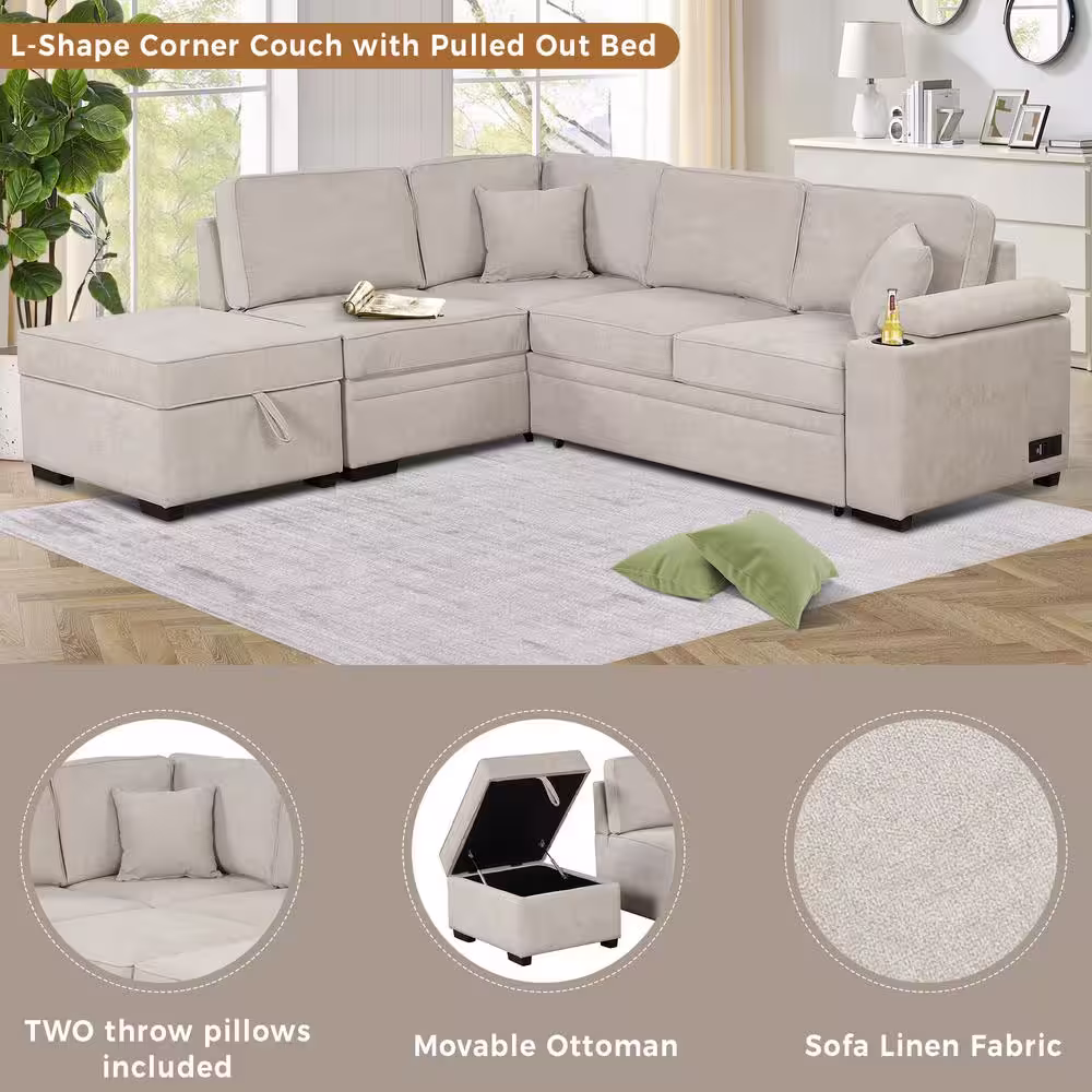 Nestfair 87.4 in. Beige Linen Upholstered L-Shaped Sleeper Sofa Bed with Twin Size Pull-out Bed and Storage Ottoman