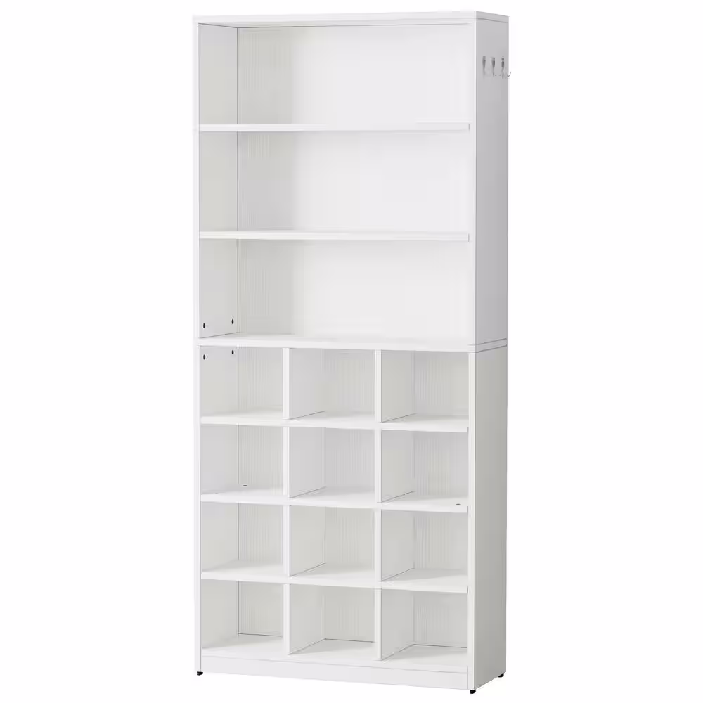None Lauren White Shoe Cabinet with Side Hooks, 24 Pair Freestanding Shoe Rack Storage Organizer for Hallway Closet Entryway