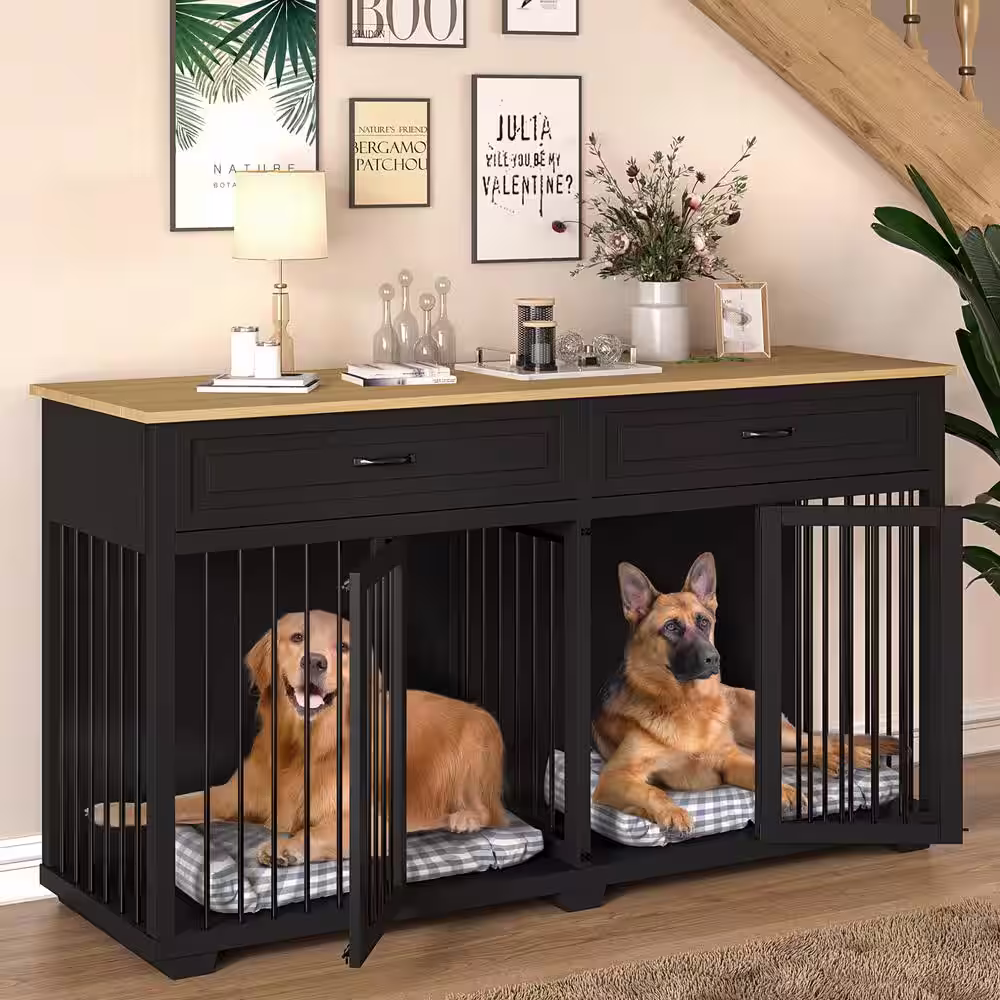 FUFU&GAGA Black Wooden Accent Storage Cabinet with 2-Drawer, Dog Crates Cage Furniture for Large Dog
