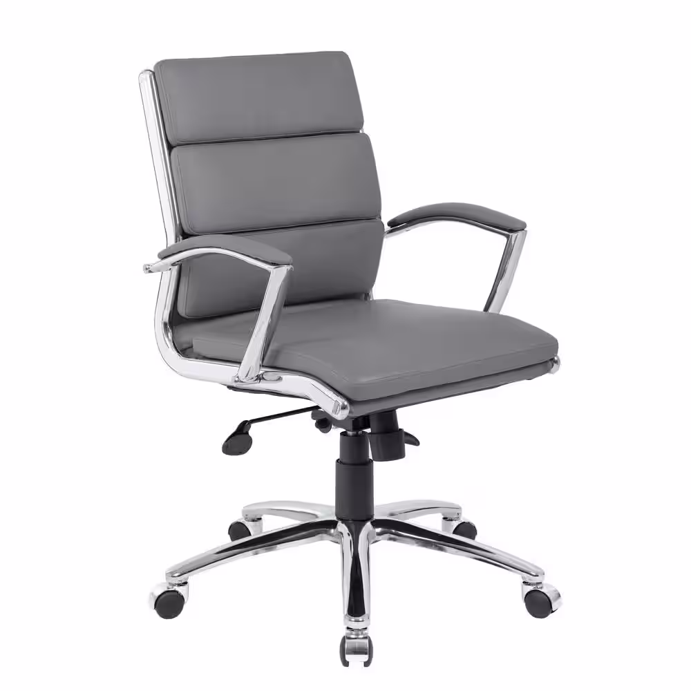 BOSS Office Products Gray Leather Mid-Back Executive Chair, Chrome Finish with Padded Arms