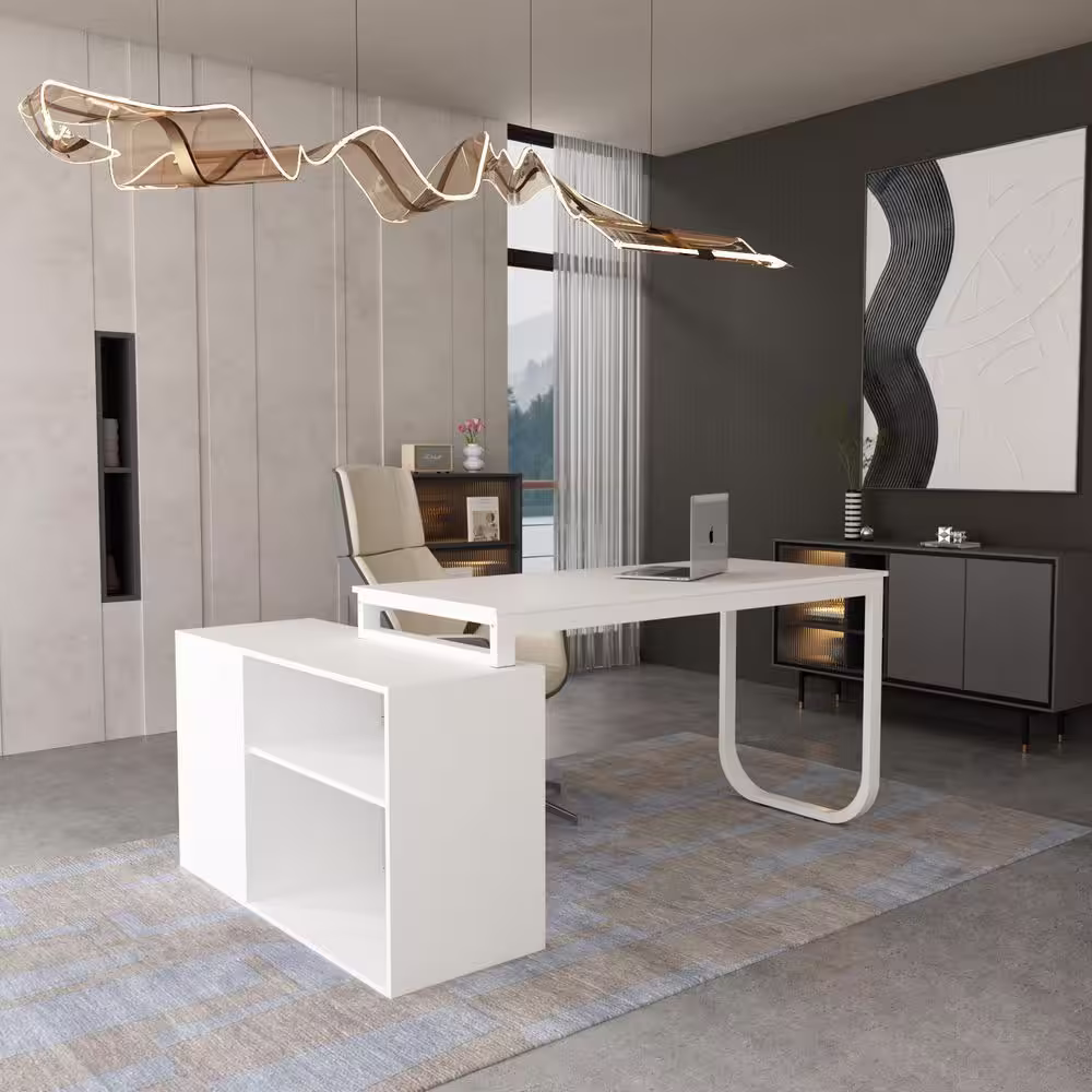 None 55.1 in. L-Shaped White Wood Executive Writing Desk Computer Desk Workstation W/Removable Tabletop, Shelves, 3-Drawers
