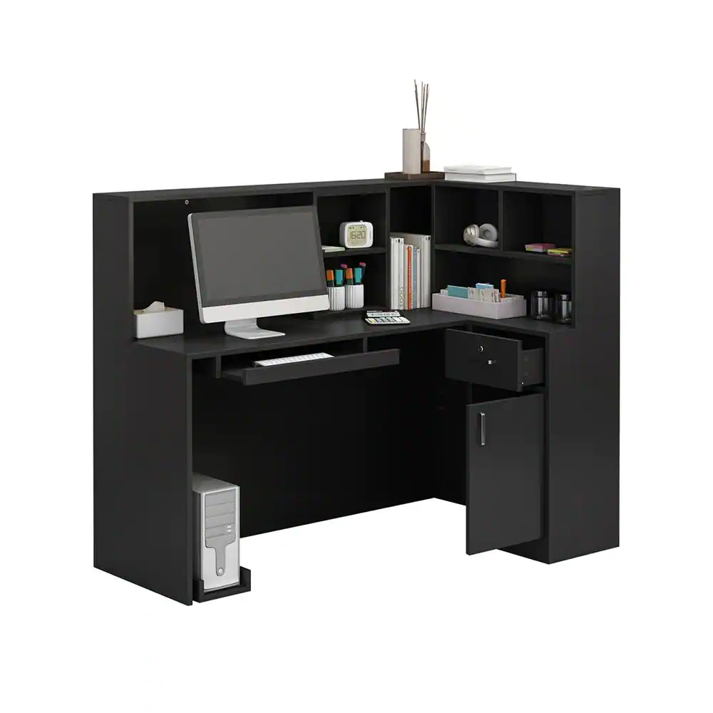 FUFU&GAGA 55.9 in. L Shaped Black Wood Executive Desk Reception Desk Computer Writing Desk W/Removable Shelves, Drawer, Cabinet