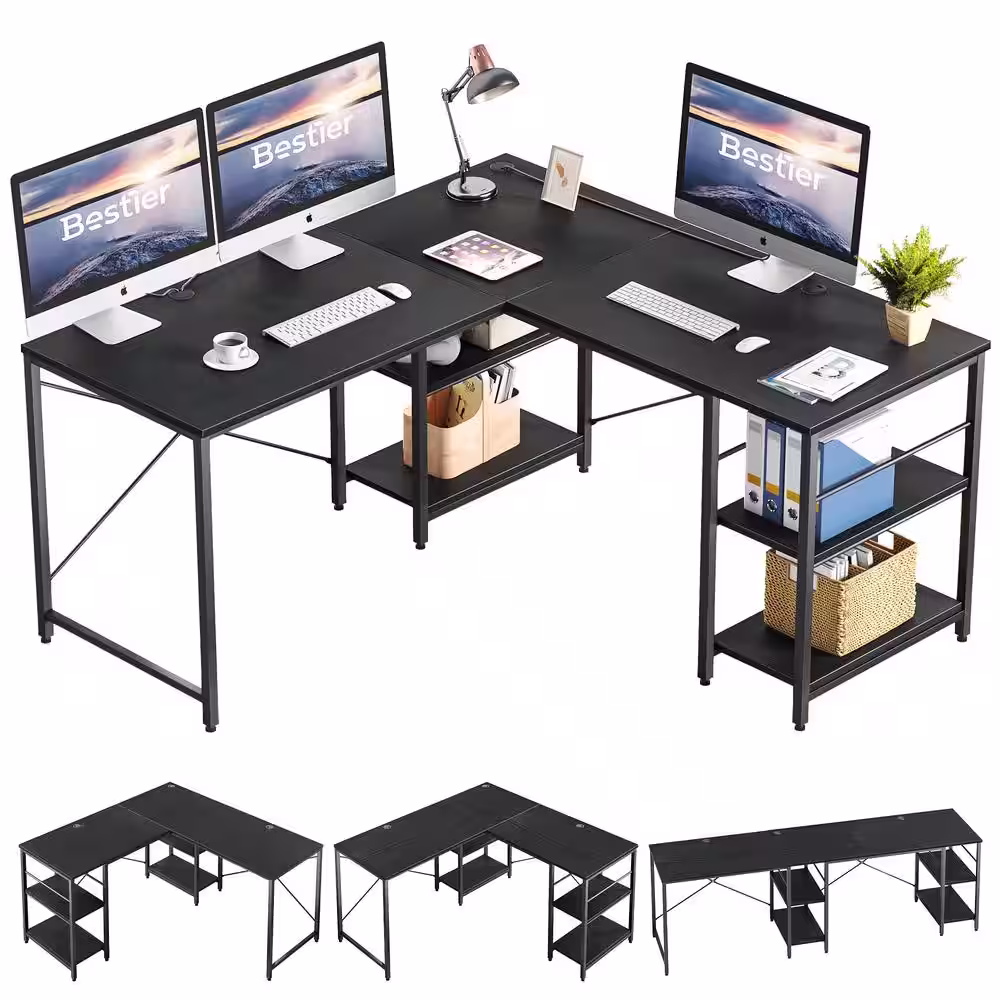 Bestier 95 in. Black - Grained L-Shaped Computer Desk with Storage Shelves