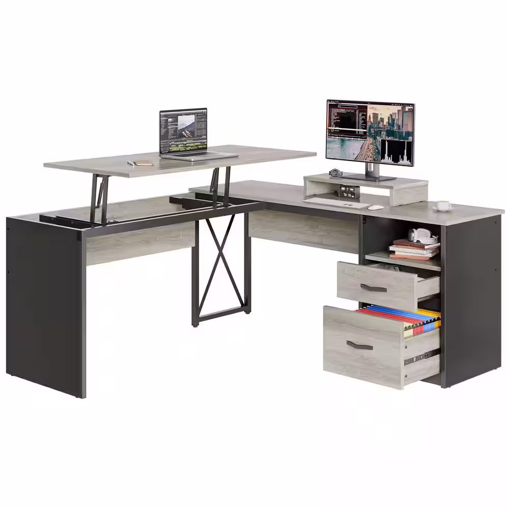 Bestier 55.7 in. Retro Grey Oak Light 2 Drawer L-Shaped Computer Desk with Lift-Top