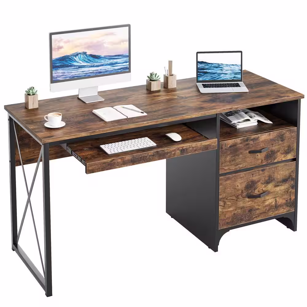 Bestier 55 in. Office Desk with Storage Drawers and Keyboard Tray Rustic Brown