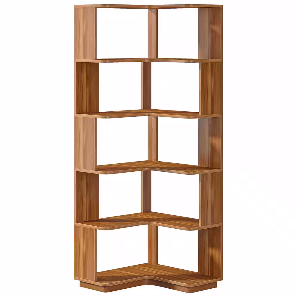 TRIBESIGNS WAY TO ORIGIN Jannelly 65 in. Brown Engineered Wood 6-Shelf Corner Standard Bookcase Bookshelf with Anti-Drop Panel