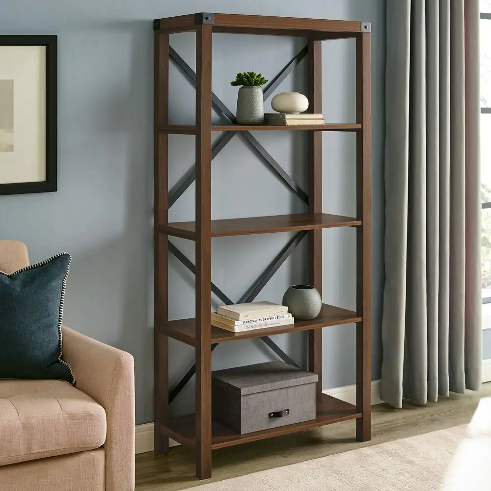 Walker Edison Furniture Company 64 in. Dark Walnut Wood 4-shelf Etagere Bookcase with Open Back