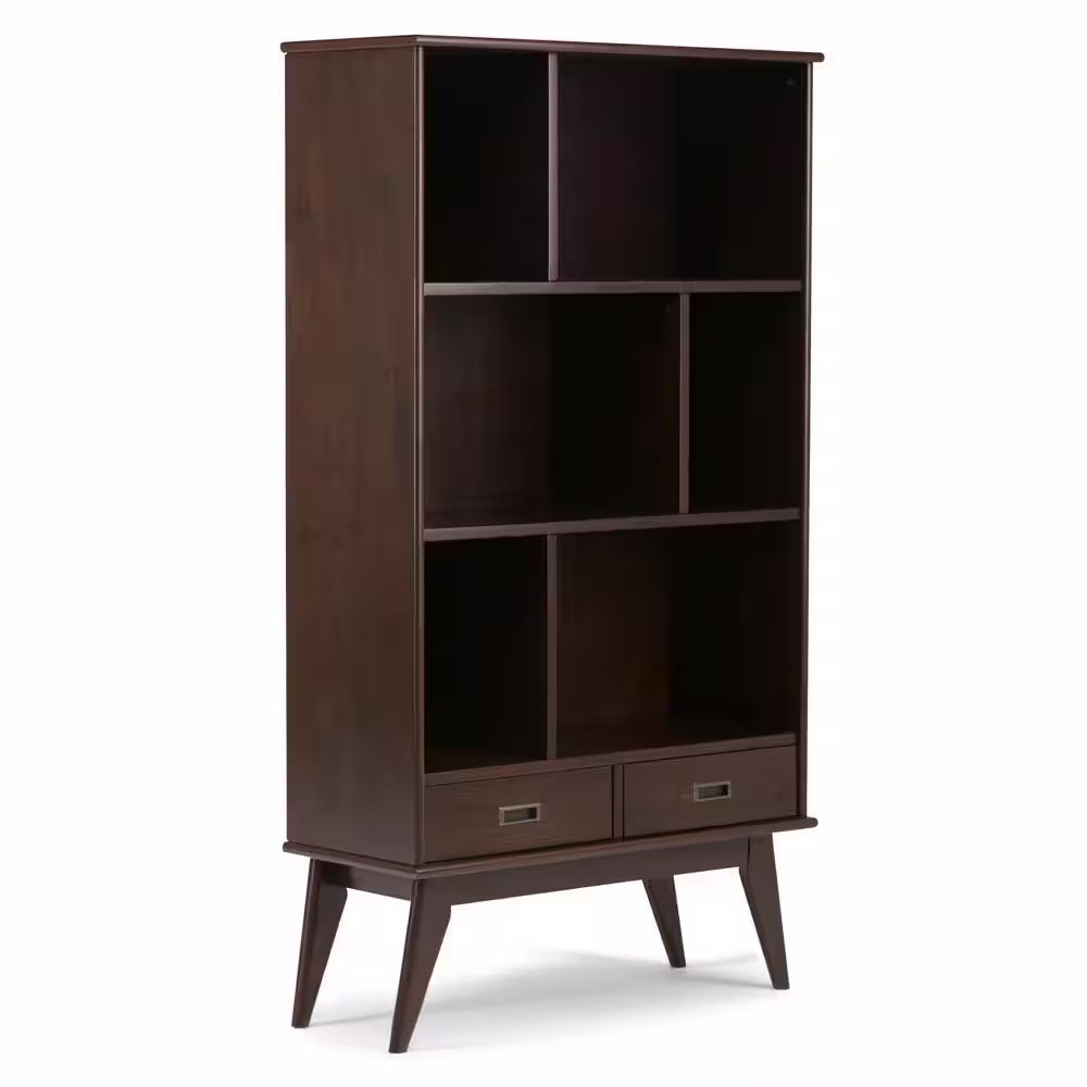 Simpli Home Draper Solid Hardwood 64 in. x 35 in. Mid-Century Modern Wide Bookcase and Storage Unit in Medium Auburn Brown