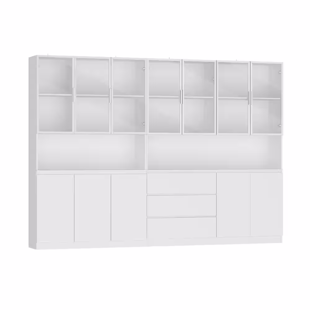 None 78.7 in. Tall White Wood 16-Shelf Standard Bookcase Freestanding Cabinet With Tempered Glass Doors, 3 Drawers