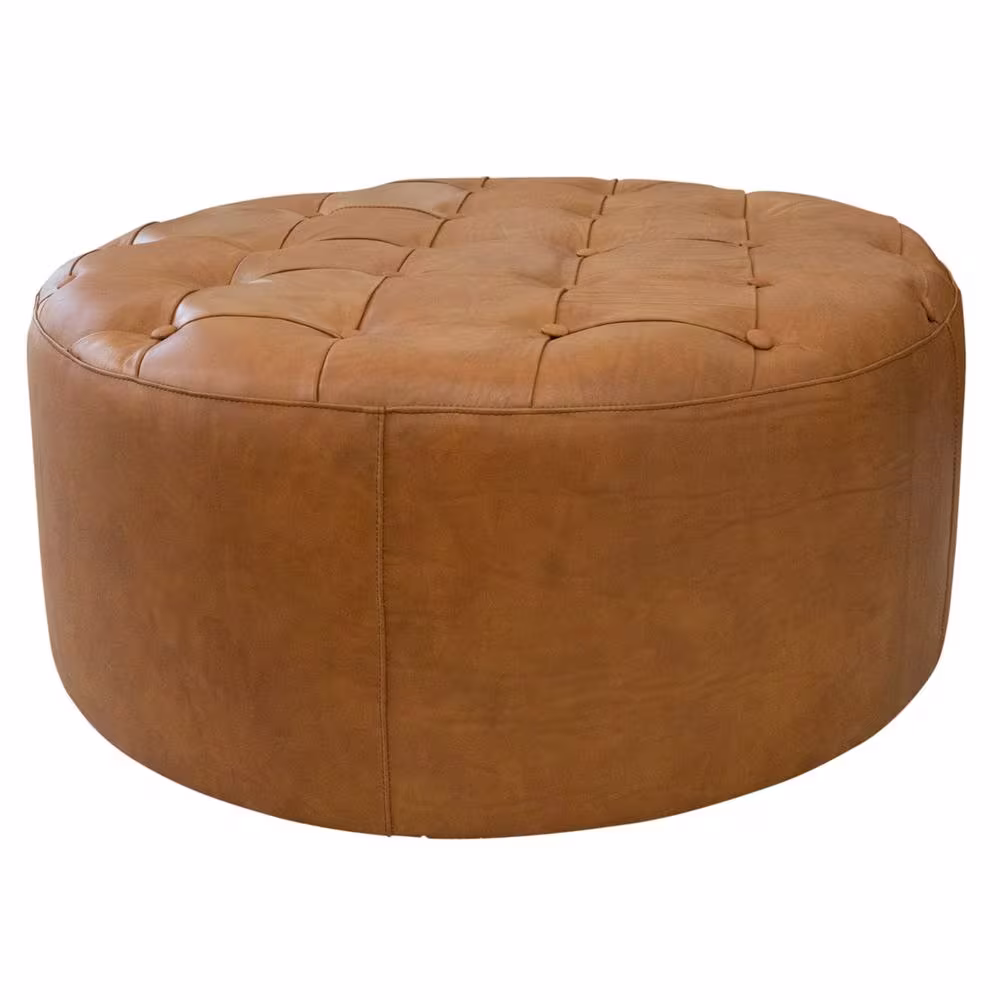 Ashcroft Furniture Co Tate Round Genuine Leather Ottoman in Tan Brown