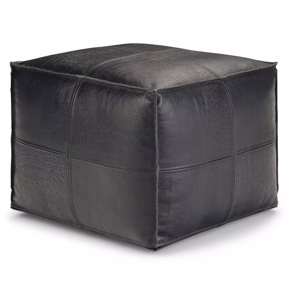 Simpli Home Bowen Boho Square Pouf in Black Genuine Leather
