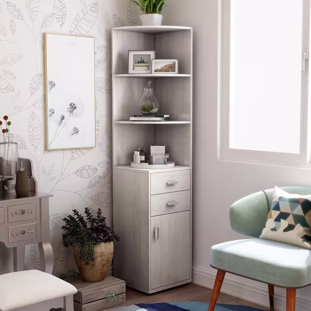 Furniture of America Hassan 70.75 in. H. Weathered Oak 6-Shelf Corner Bookshelf With Drawers