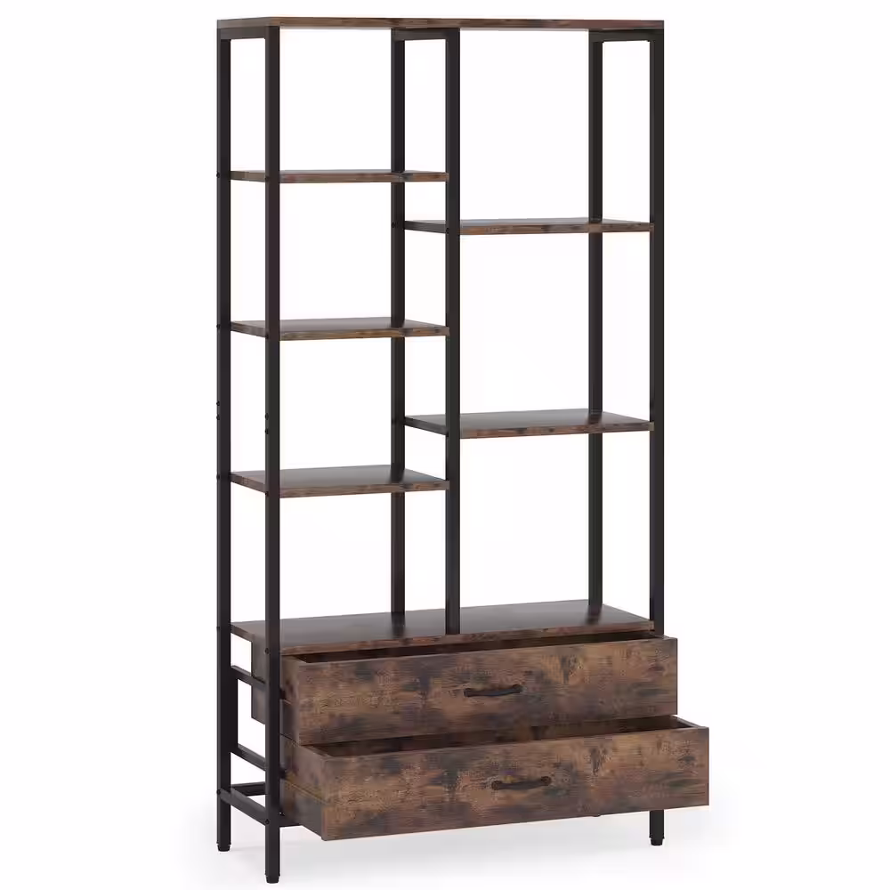 BYBLIGHT Eulas 66.9 in. Rustic Brown Wood 7-Shelf Standard Bookcase 2-Drawers Home Office 31.49 in. W x 11.81 in. D x 66.92 in. H