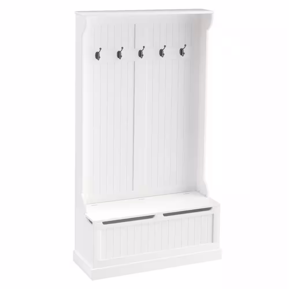 HOMCOM White Hall Tree Storage Bench and Coat Rack with 5 Steel Double Hooks and Anti-Topple Anchor for Entryway