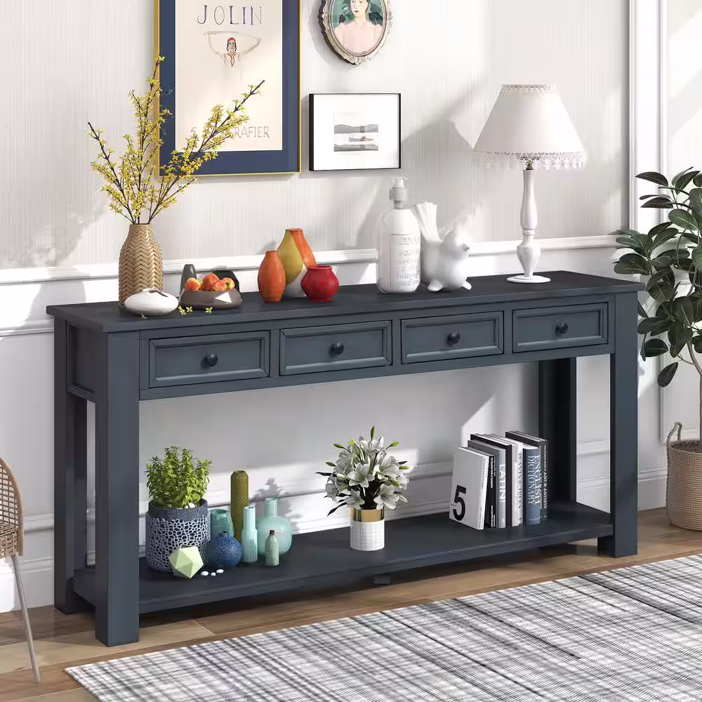 URTR 63 in.Navy Rectangle Wood Long Console Table with 4 Drawers and Bottom Shelf, Sofa Table for Entryway Hallway