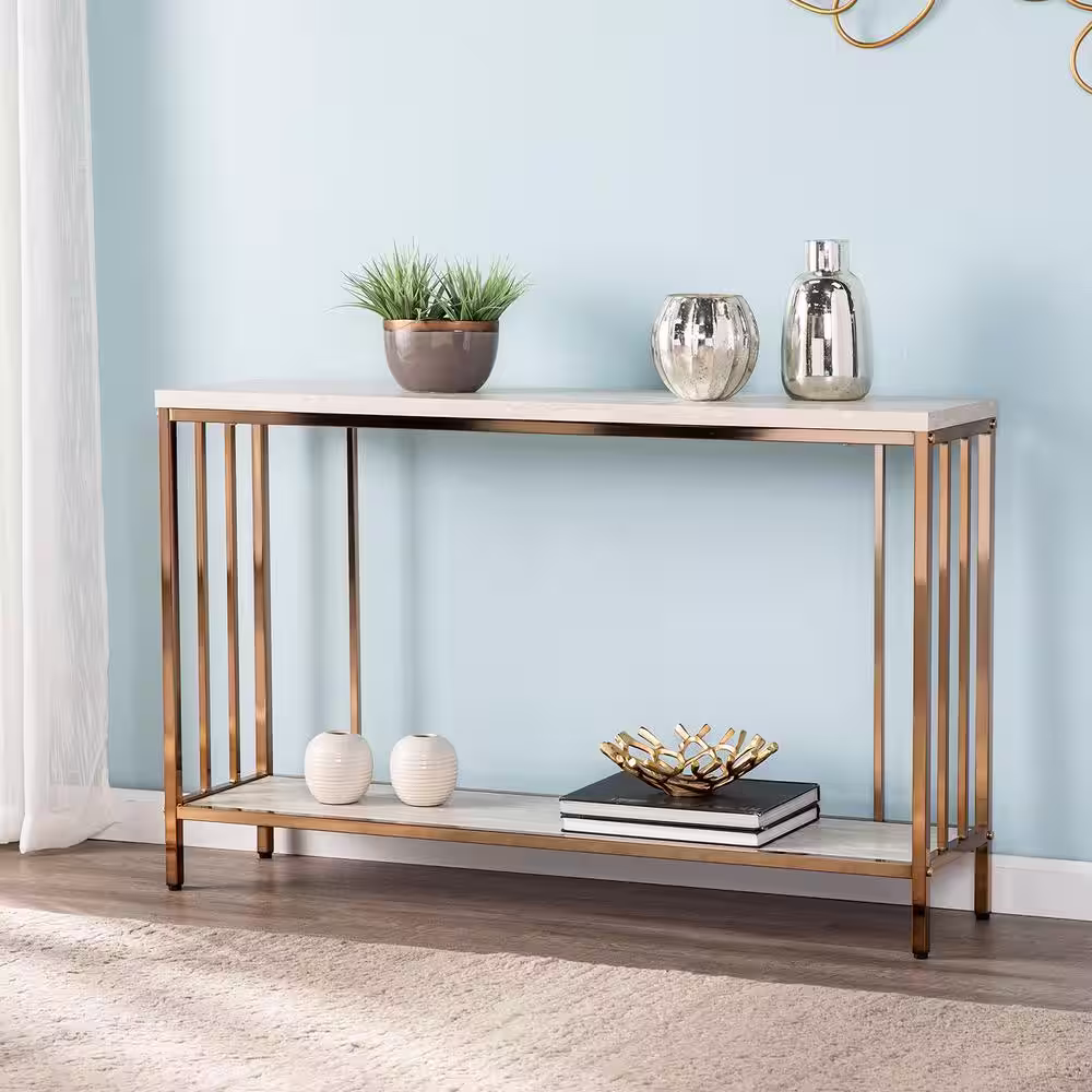 Southern Enterprises Rippert 48 in. Champagne/White Rectangle Stone Console Table with Storage