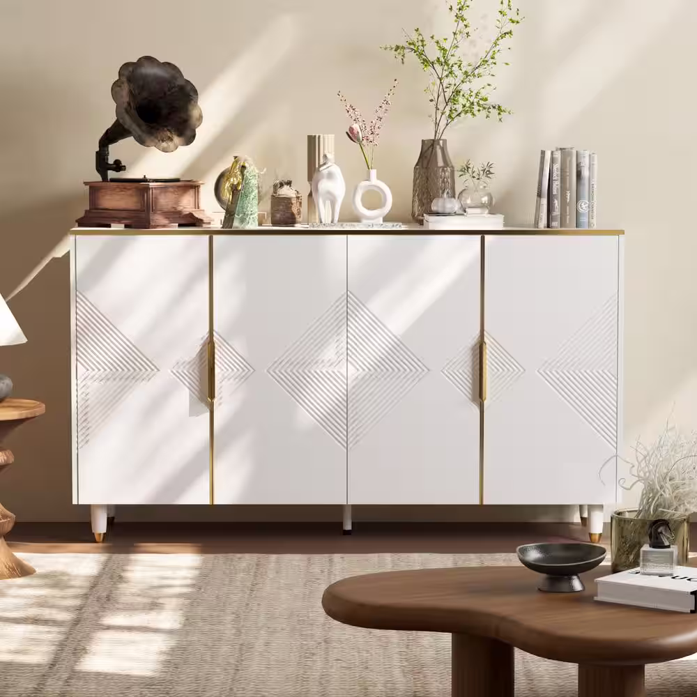 None 63 in. W White Rectangle Wood Diamond Texture Console Table Entryway Table Hallway Living Room with Adjustable Shelves