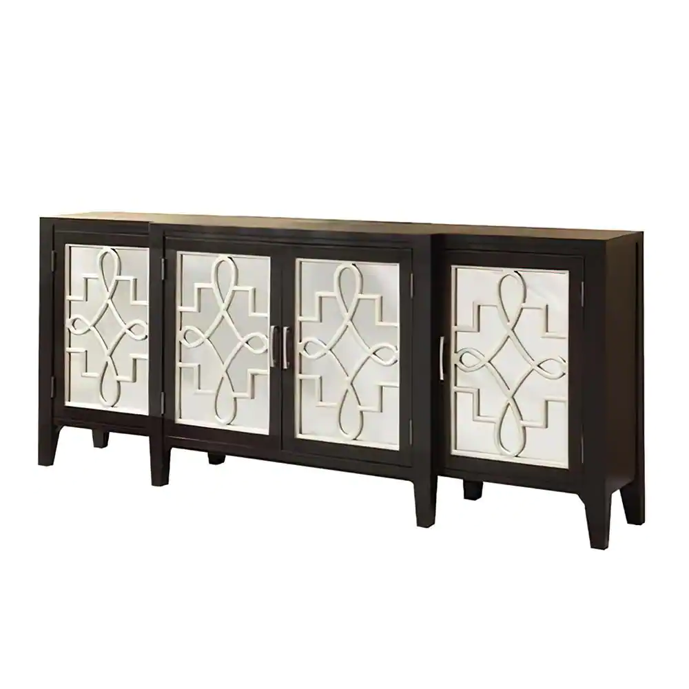 Powell Company Kinsey 58 in. W Warm Wood Finish 30 in. H Rectangular Acacia Console Table with 3-Gold Door Panels and 4-Shelves