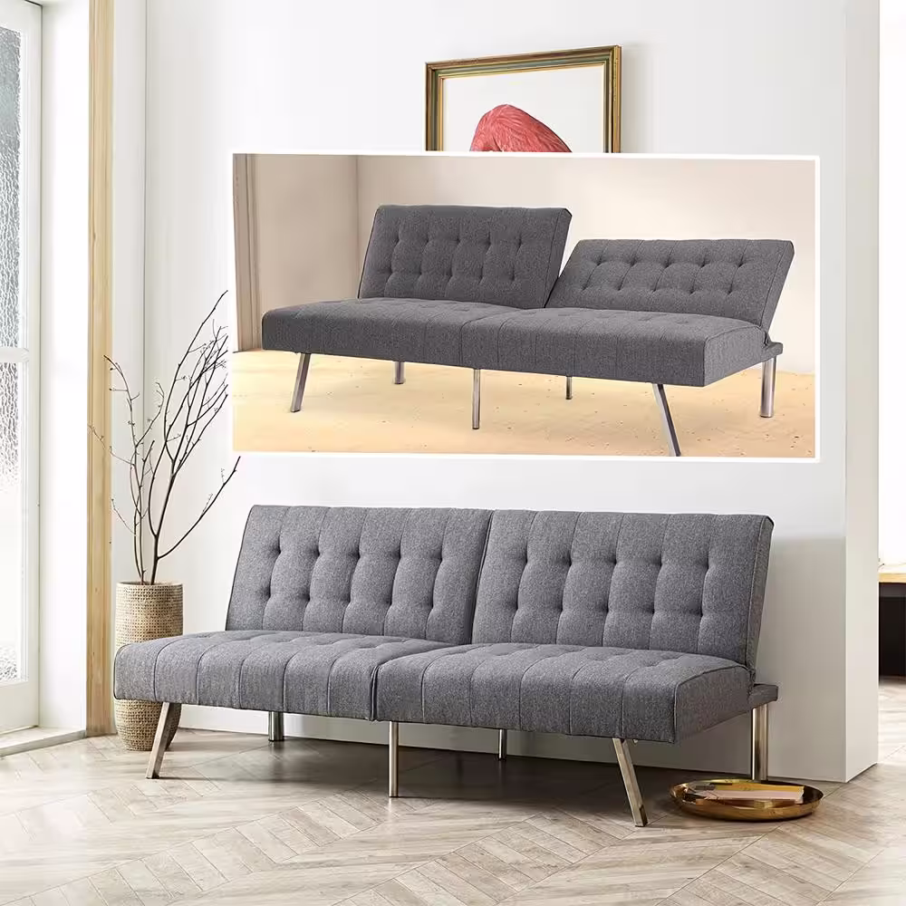 HOMESTOCK Gray, Linen Tufted Split Back Futon Sofa Bed, Linen Couch Bed, Futon Convertible Sofa Bed with Metal Legs
