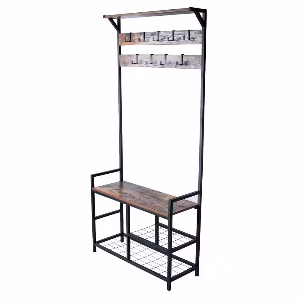 None Brown and Black Metal with Wooden Bench 2-Wire Meshed Shelved Coat Rack