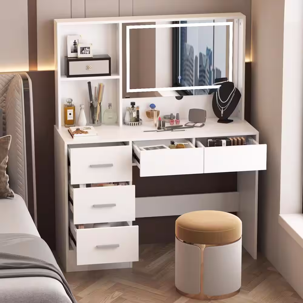 None 5-Drawers White Wood Makeup Vanity Sets Dressing Table Sets With LED Push-Pull Mirror, Stool and Storage Shelves