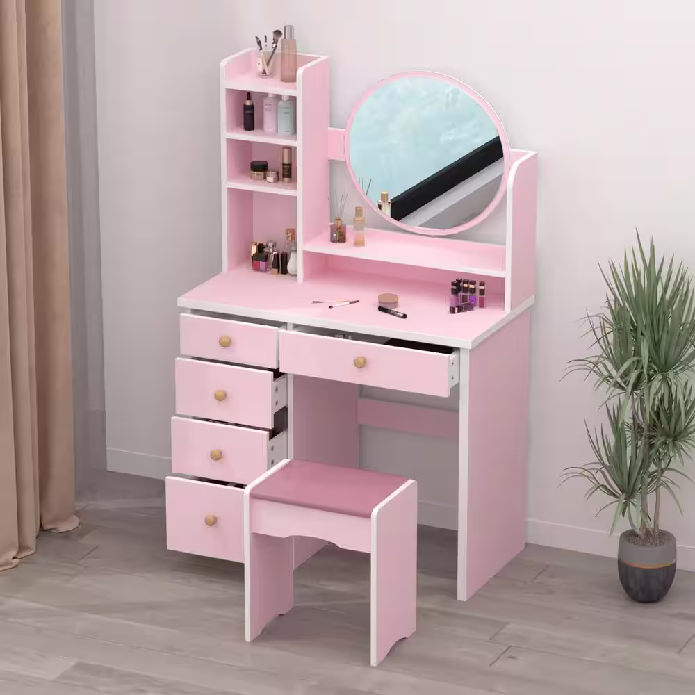 WIAWG 5-Drawers Pink Makeup Vanity Dressing Table Set with Stool, Mirror and Storage Shelves Girls Dressing Table