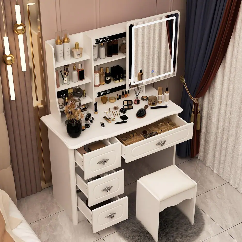 FUFU&GAGA 4-Drawers Push-Pull Mirror White Makeup Vanity Sets Dressing Table Sets With Color Change LED, Stool, 3-Tier Shelves
