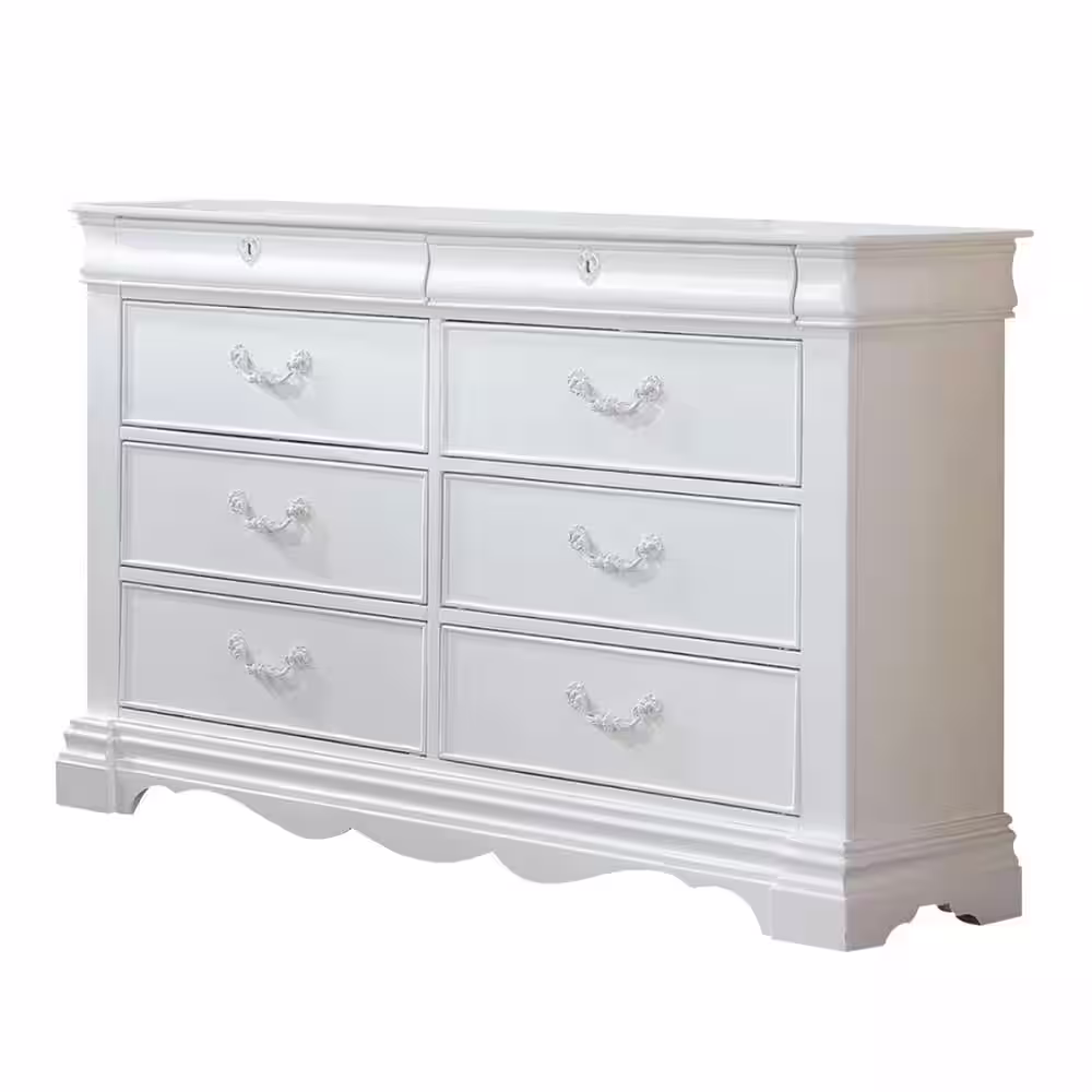 Benjara 8-Drawers White Wooden Dresser with Antique Metal Handles 56 in. L x 15.7 in. W x 37.2 in. H