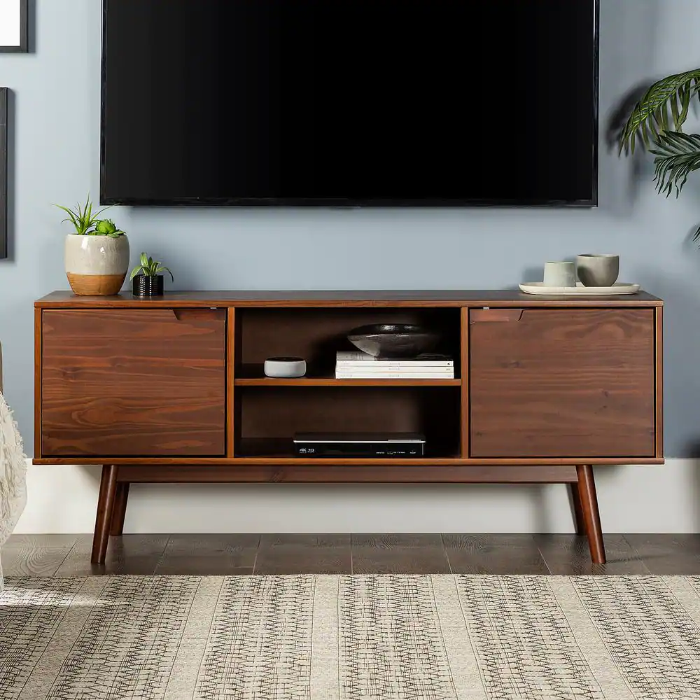 Welwick Designs 58 in. W Walnut Solid Wood TV Stand with Cutout Cabinet Handles (Max tv size 65 in.)
