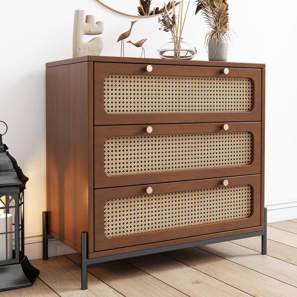 Harper & Bright Designs Walnut Modern Cannage Rattan Wood 3-Drawer 30 in. Wide Chest of Drawers