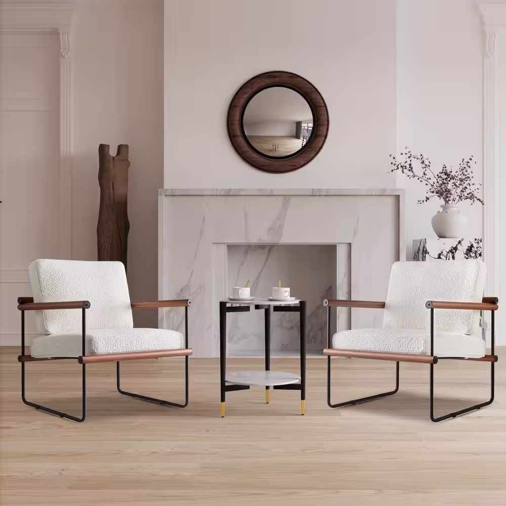 GOJANE 16.7 in. White Round Slate Stone Coffee Table and Single Upholstered Armchair with 3 Pieces