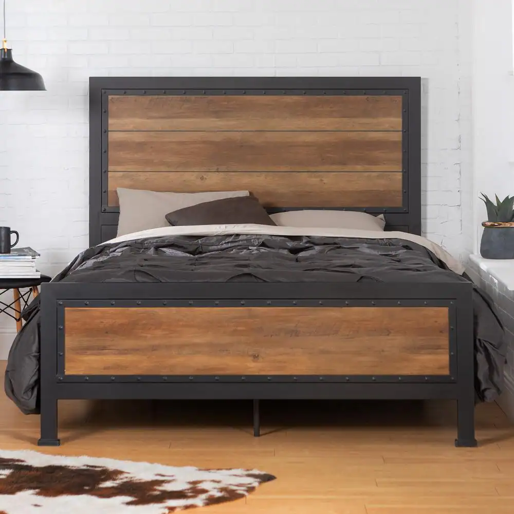 Walker Edison Furniture Company Rustic Home Rustic Oak Queen Size Metal Bed Frame with Wood Accents