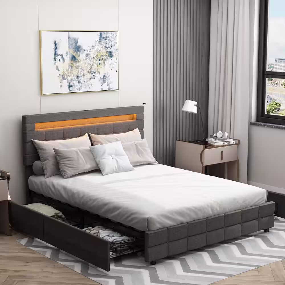 None Gray Wood Frame Queen Size Bed Platform Bed With 4-Drawers, Color-Changing LED Lights, Bluetooth, Adjustable Headboard