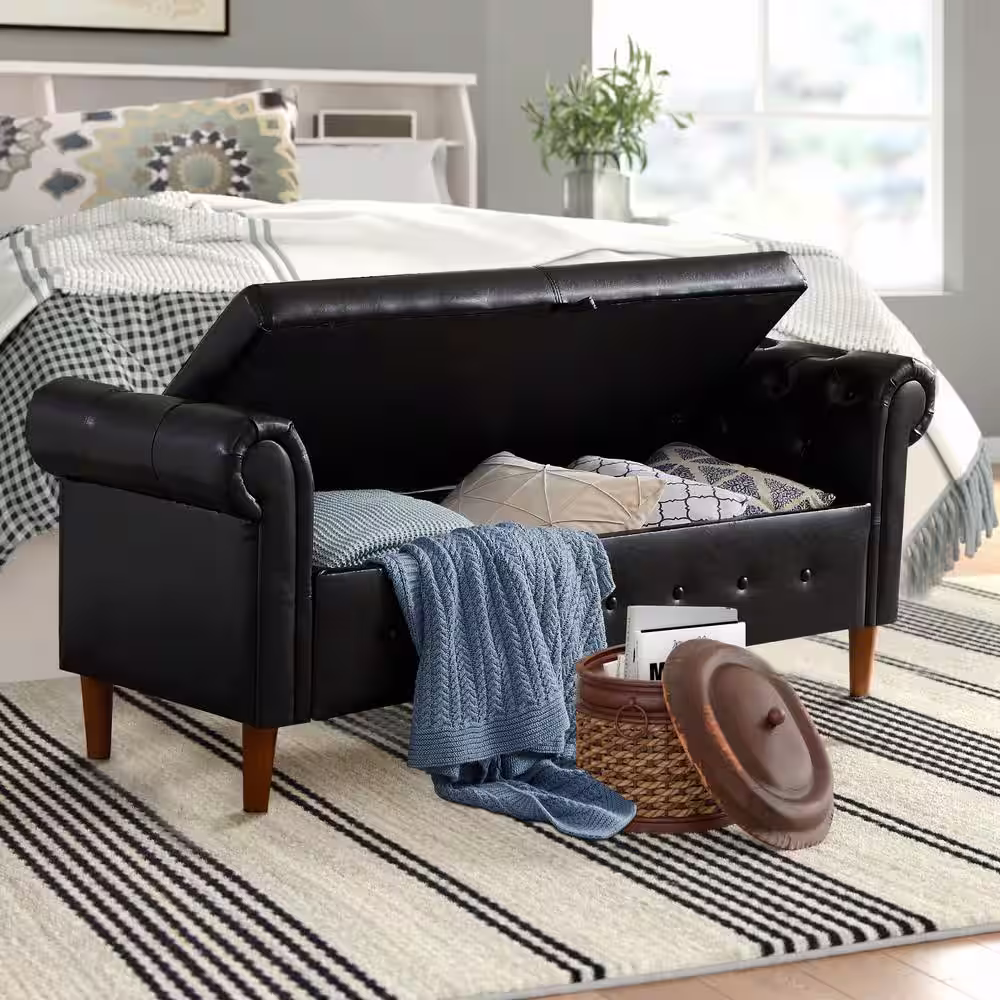 None Black Tufted Fabric/PU Storage Bench 63 in. L x 22.1 in. W x 24.1 in. H