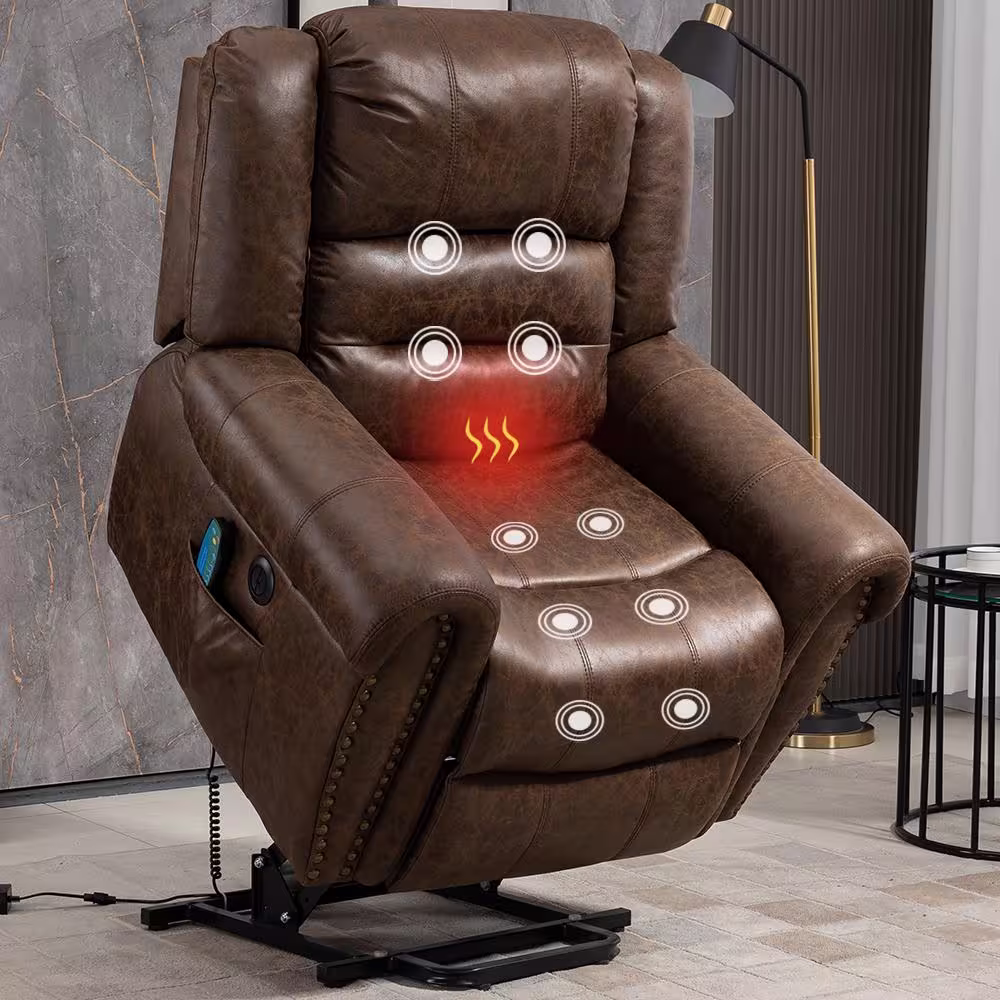 aisword Deluxe Antique Brown Faux Leather Lift Recliner Sofa Chair (Up to 330lbs) with Massage, Heating and Nailhead Trim