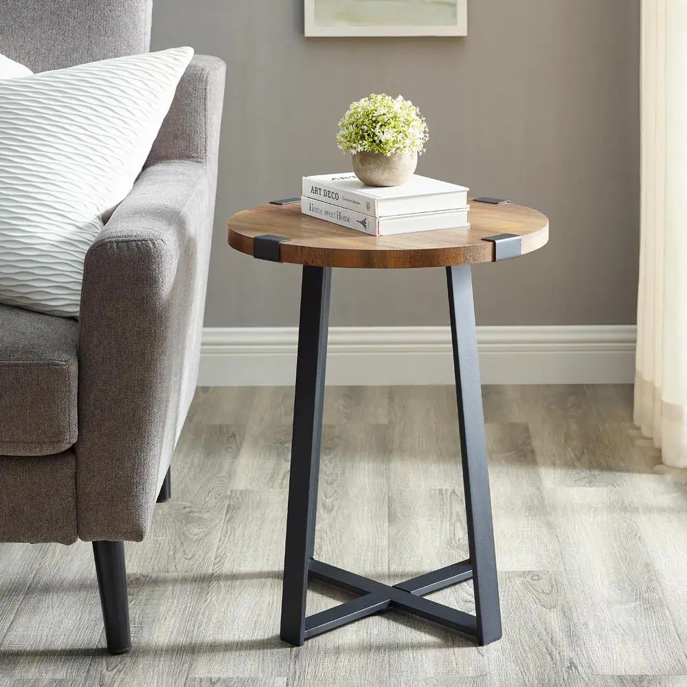 Walker Edison Furniture Company 18 in. Rustic Oak Rustic Urban Industrial Wood and Metal Wrap Round Accent Side Table