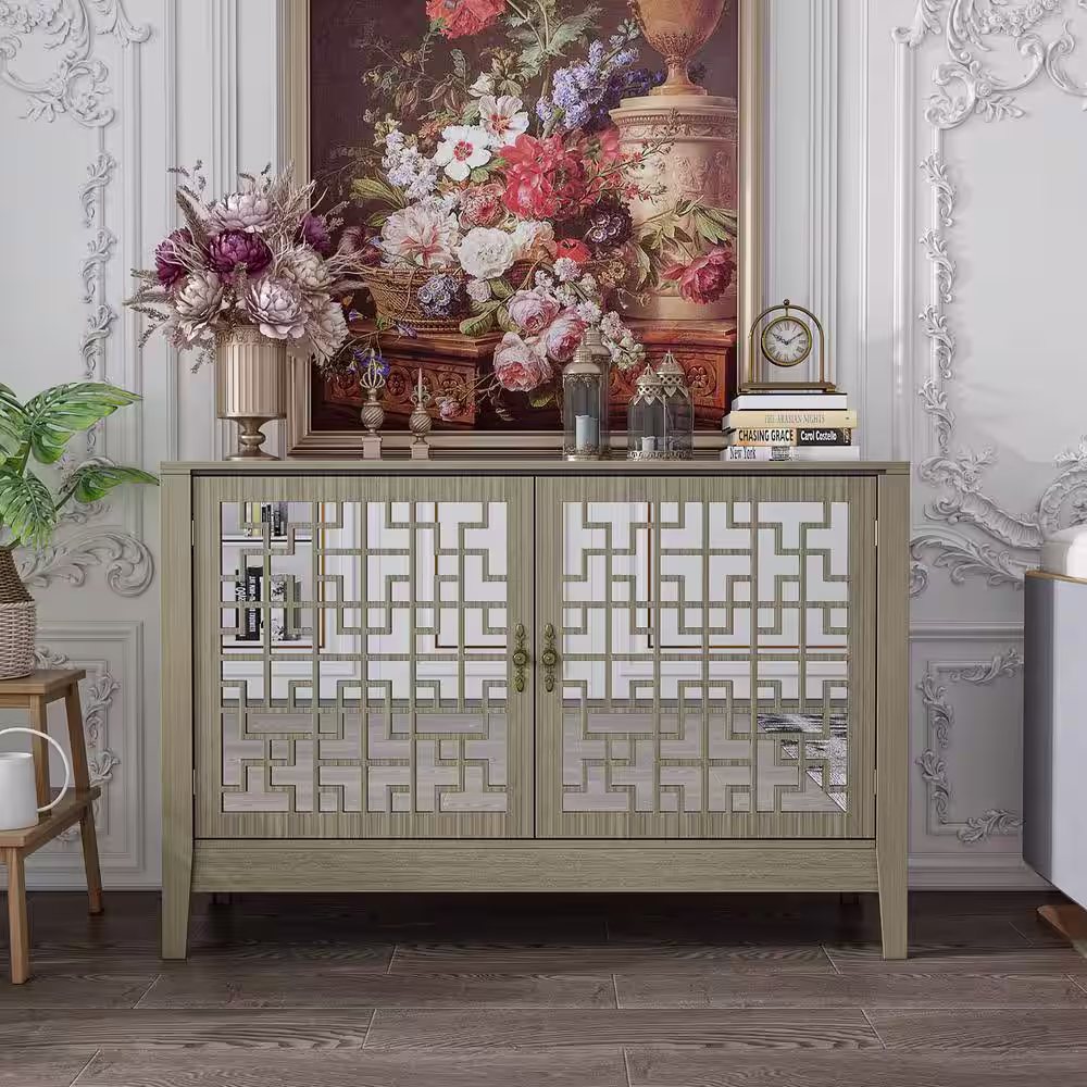 None 47.2 in. Width Gray Wooden Grain Rectangle Wood End Table Storage Cabient Sideboard with Mirrored Doors and 4 Shelves