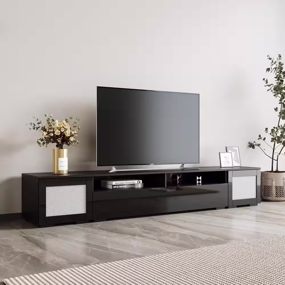 Harper & Bright Designs Black Rattan Style Extended TV Stand Fits TV's up to 90 in. with Storage Cabinets and Color Changing LED Light
