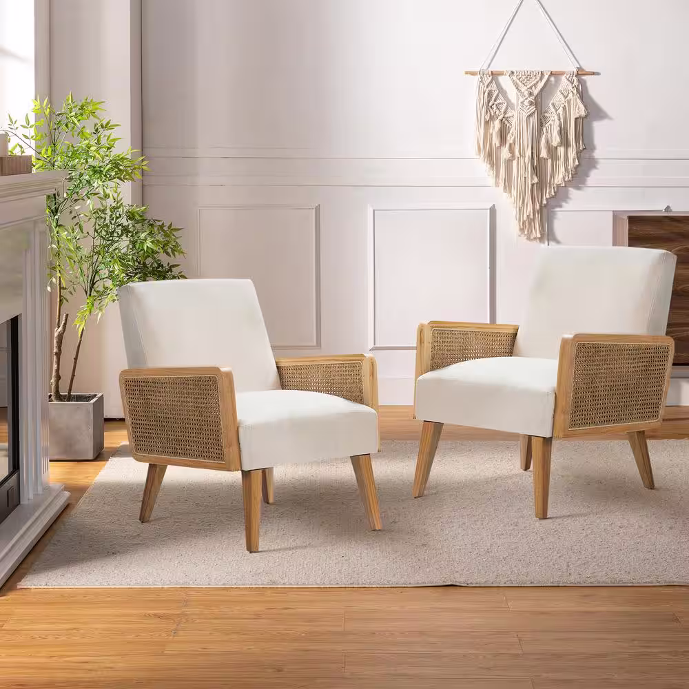JAYDEN CREATION Delphine Modern Linen Accent Chair with Rattan Armrest and Wood Legs for Living Room and Bedroom (Set of 2)