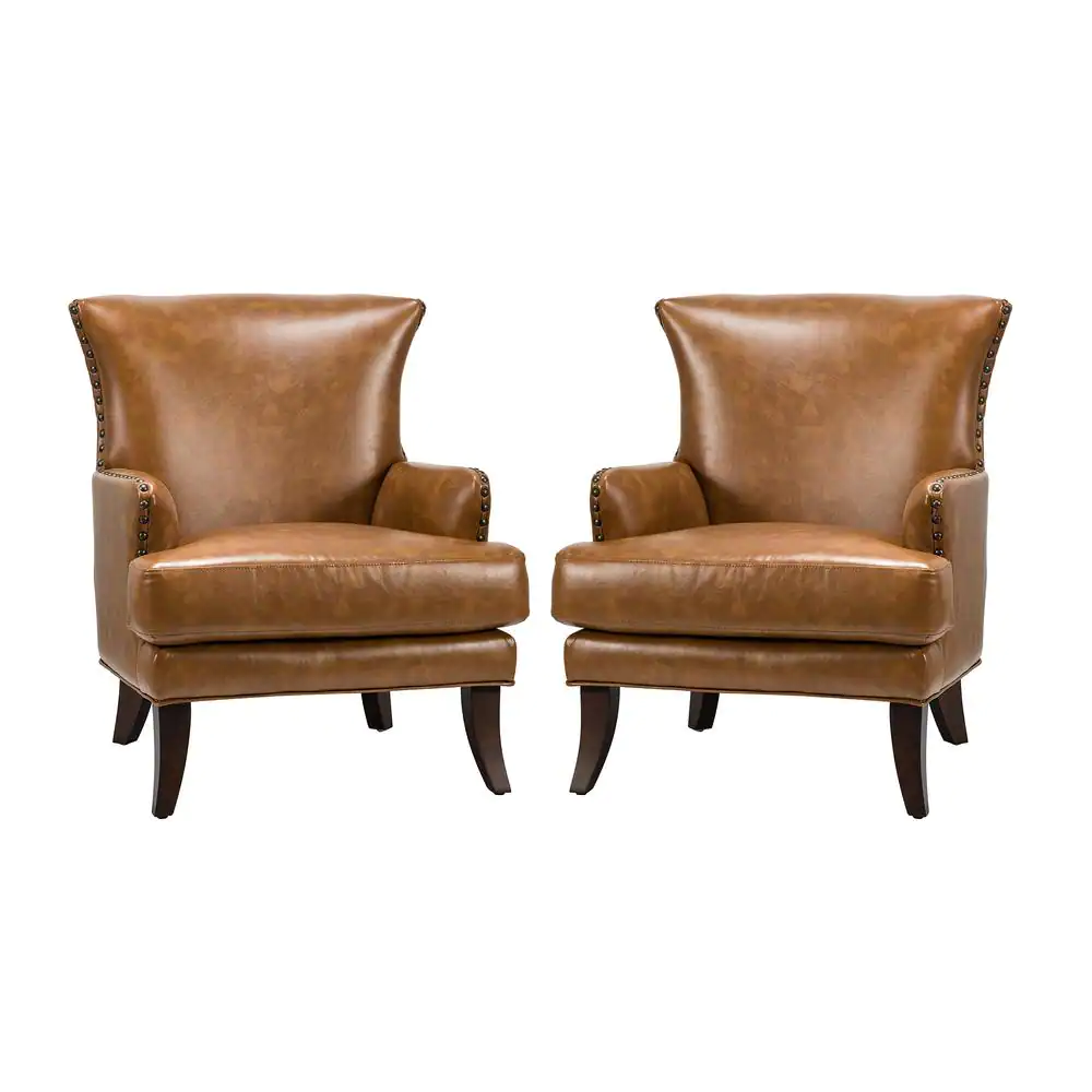 JAYDEN CREATION Bonnot Transitional Camel Faux Leather Wingback Armchair with Nailhead Trim and T-Cushion (Set of 2)
