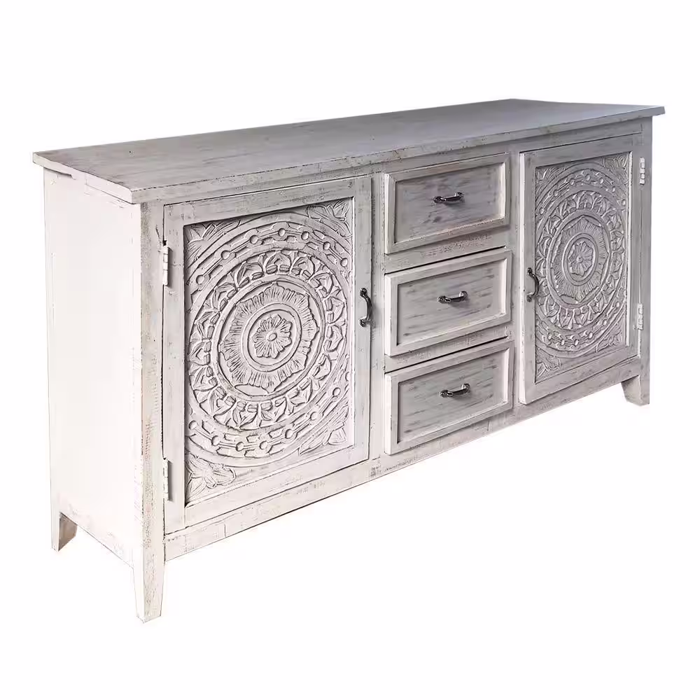 THE URBAN PORT Antique White Mango Wood Handcrafted Farmhouse Carved Sideboard Console Buffet with 2-Engraved Doors and 3-Drawers