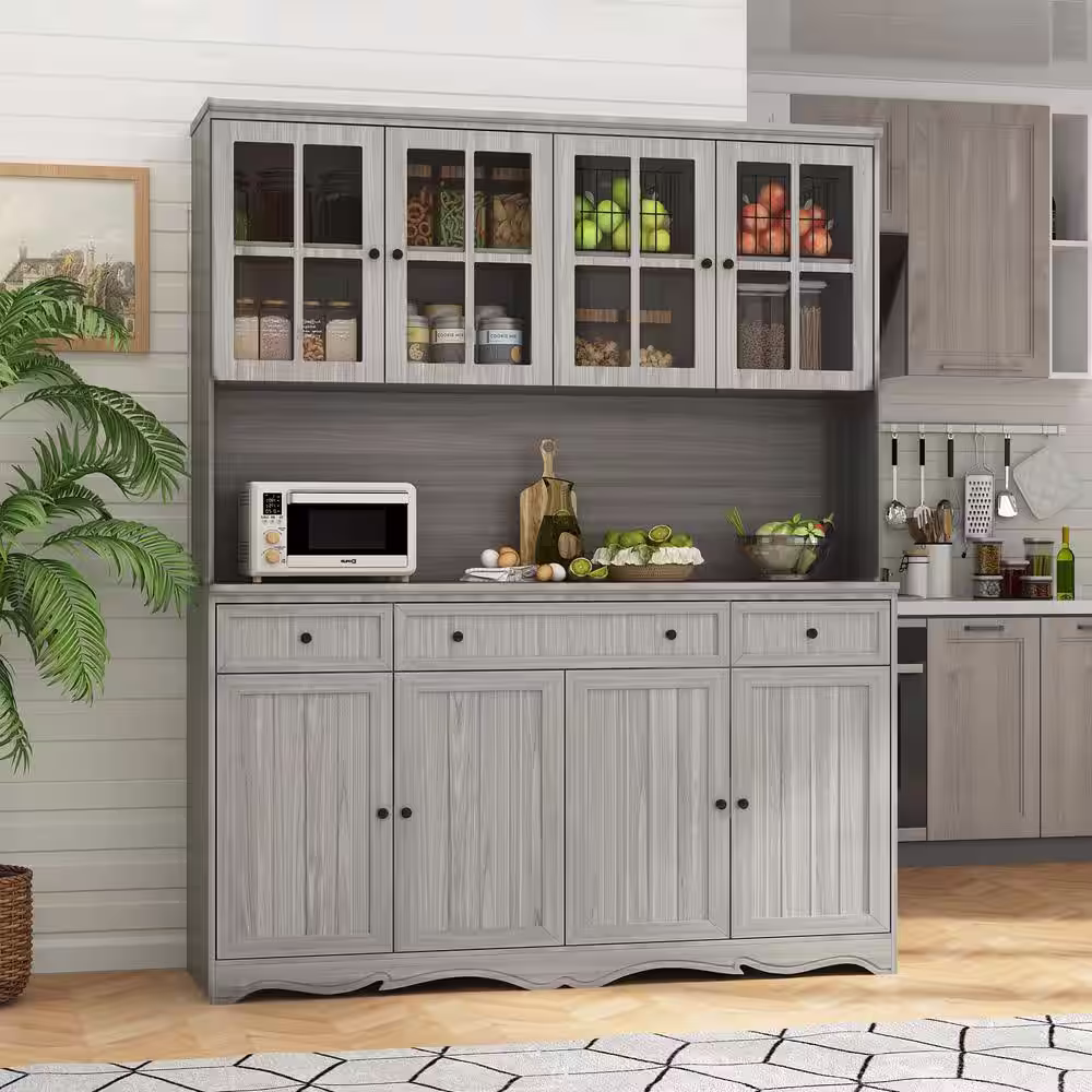 None Gray Painted Wood 61.2 in. W Food Pantry Cabinet With Drawers and Adjustable Shelves, Glass Doors, Hutch