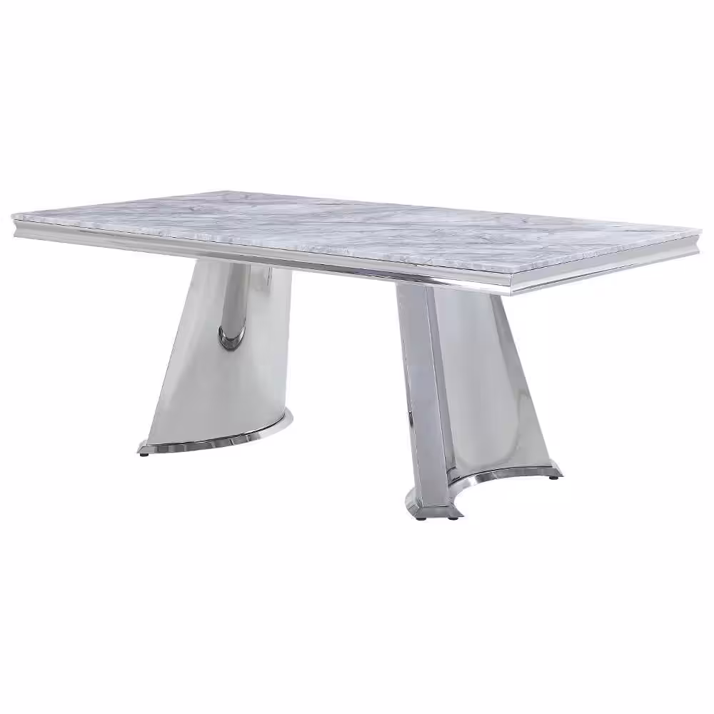 Acme Furniture Destry Mirrored Silver Faux Marble Double Pedestal Dining Table Seats 6