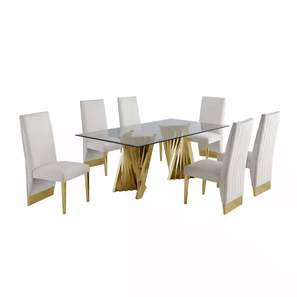 None Becky 7-Piece Rectangular Glass Top with Gold Stainless Steel Base Table Set with 6-Cream/Beige Nail Head Velvet Chair
