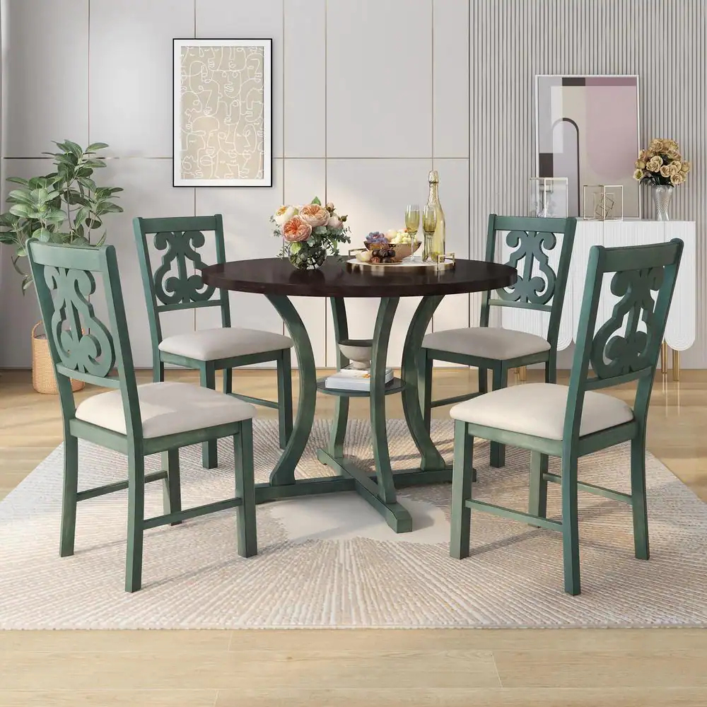 Harper & Bright Designs Exquisitely Designed 5-Piece Wood Top Greenish Antique Blue Dining Set with Special-shaped Legs and Hollow Chair Back
