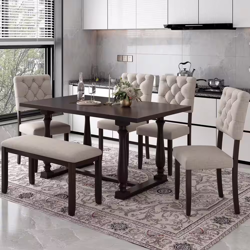 Harper & Bright Designs 6-Piece Espresso Wood Top Dining Table and Chair Set with Special-Shaped Legs and Foam-Covered Seat Backs Cushions