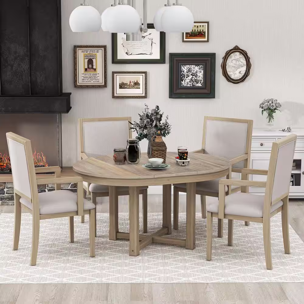 Harper & Bright Designs 5-Piece Natural Wood Wash Round to Oval MDF Top Dining table Set Seats-4 with Extendable Butterfly Leaf and 4-Chairs